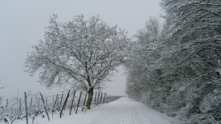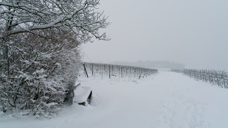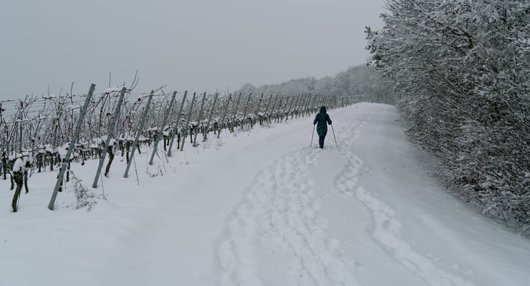 Im Winter sind die Weinberge von Würzburg von Schnee bedeckt, wodurch die Hügel klar und reduziert wirken. Zwischen den historischen Terrassen und Wegen ist das Zusammenspiel von Natur und Tradition spürbar. Für die Fotografie bieten Licht und Schatten interessante Geometrien und Kontraste, die die Szene sofort festhaltenswert machen.